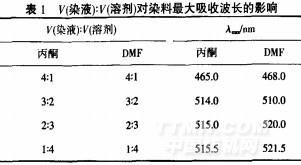 溶劑性質(zhì)、用量都會影響染料的吸收光譜17I,為此,配制了分散紅3B0.2g/L、分散劑NNOlg/L、pH值為5的染液,再將該染液按照一定體積比加入丙酮或者DMF后,用分光光度計測試染料的最大吸收波長,結果見表1.