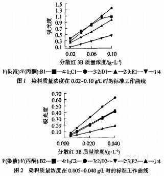 溶劑含量影響染料的溶解度,也就影響所測的吸光度數(shù)值,而且1.5中計算上染百分率公式的使用前提是所測吸光度與染料質(zhì)量濃度呈線性正比關系.為此。本文選用丙酮與DMF兩種溶劑,討論其在不同染料質(zhì)量濃度范圍內(nèi)所作的標準吸光度曲線的直線相關程度,以此找出染料與有機溶劑的最佳配比以及測試時染料的稀釋倍數(shù).
