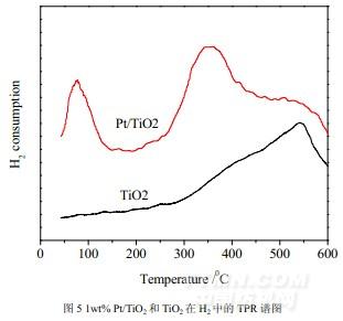 為了進一步考察負載Pt后催化劑表面存在的氧物種以及Pt的負載對載體Ti-O鍵的影響,分別對空白載體TiO2和催化劑1wt%Pt/TiO2進行了程序升溫還原(TPR)實驗。測試結果如圖5所示。