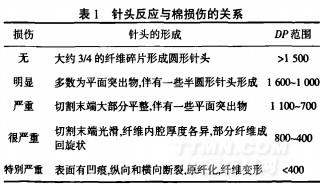 通過顯微鏡可快速測試棉的化學損傷并估計損傷的程度.用鋒利的尖刀或刀片將測試纖維切割成大約1mm的碎片,然后放到含15%氫氧化鈉的載玻片上,用蓋玻片加蓋2—3min,最后測試在切割末端形成的針尖.在未損傷棉中初生胞壁完整無缺,因此,次生胞壁內的纖維在氫氧化鈉溶液中劇烈溶脹,纖維在切割末端緊壓形成針尖狀.化學損傷纖維由于初生胞壁受到破壞,纖維可以無限溶脹,因此,不能形成針尖狀.經過交聯免燙整理的棉只發生稍微溶脹,不能形成針尖,據此可知纖維受到較大的化學損傷.針尖反應適合于棉纖維的各個加工和整理階段,但是對亞麻或苧麻則不適用. [2]174-17590%以上的纖維素交聯劑含有甲醛,因而可用鉻變酸測試織物上的甲醛來進一步驗證針尖反應的準確性:少量纖維在1~2mL 72%的硫酸中加熱到最高溫度(100℃),其中100mL硫酸溶液中含10g鉻變酸.如果l~2min后有紅紫色形成則表示有甲醛存在.針頭反應與棉損傷的關系見表1.