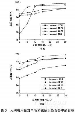 綸的等電點,兩種纖維均具有兩性性質(zhì),帶有較多的負(fù)電荷,染料陰離子需要克服較大的靜電斥力才能上染纖維。加入元明粉能夠降低纖維表面的Zeta電位.促進染料的上染。但是,元明粉用量過大,會導(dǎo)致染料的聚集度增加,甚至使染料發(fā)生沉淀,從而影響到染料的最終上染百分率,并造成一定的污染和浪費。所以,元明粉用量應(yīng)控制在l5L左右。
