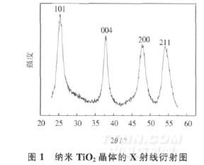 TiO2有3種晶型,即板鈦礦、銳鈦礦和金紅石.具有紫外激活效應的主要是銳鈦礦和金紅石,其中銳鈦礦為低溫晶型,金紅石為高溫晶型.從紫外光催化激活效應角度講,銳鈦礦比金紅石性能更好,催化活性更高[7].烘干整理劑得到的納米TiO2晶體的X射線衍射圖如圖1所示.