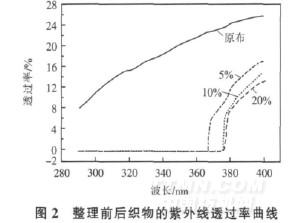 織物經不同質量分數(20%、10%和5%)的納米TiO2整理劑整理前后紫外線透過率曲線如圖2所示.