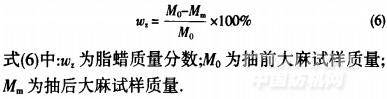 麻纖維中的脂是高級脂肪酸的甘油酯,蠟質(zhì)的主要成分是高級飽和脂肪酸和高級一元醇所形成的酯,此外,尚有部分游離的高級脂肪酸、高級醇及烴類.脂和蠟均不溶于水,但可被有機溶劑萃取.采用質(zhì)量法測定,稱取3 g麻試樣,烘干稱質(zhì)量后放在油脂抽出器中,用苯和乙醇溶液[V(苯):V(乙醇)=2:l]在恒溫下萃取4 h(回流速率4-6次/}1),烘干稱質(zhì)量,按公式(6)計算脂蠟的質(zhì)量分數(shù):