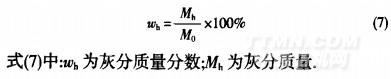 麻纖維中的灰分大多為金屬或非金屬氧化物及無機鹽類物質(zhì),如Si02、P205、Fe203、CaO、MgO、K20及鈣鹽、鎂鹽、鉀鹽等.采用質(zhì)量法測定,稱取3 g麻試樣,放入坩堝烘干,稱質(zhì)量后,在馬弗爐上(750-850)℃灼燒2 h,冷卻稱質(zhì)量,用公式(7)計算灰分的質(zhì)量分數(shù):