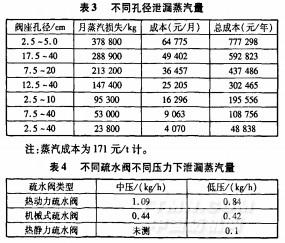 表3—4分別為不同孔徑閥座泄漏的蒸汽量(O.7MPa下),以及不同類型疏水閥在不同壓力下泄漏的蒸汽量。