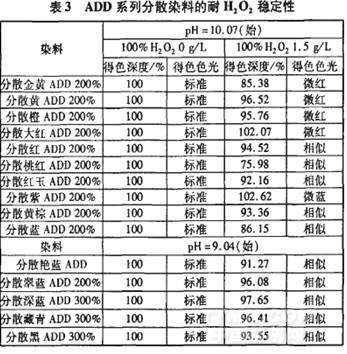 ADD系列耐堿分散染料的耐H202穩(wěn)定性見表3。