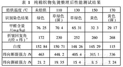 對純棉織物進(jìn)行樹脂免燙整理,焙烘后剪取6 cm×4 cm試樣,稱重,進(jìn)行染色試驗(yàn)。免燙整理試樣的顏色、強(qiáng)力、甲醛含量和折皺回復(fù)角等結(jié)果見表1。