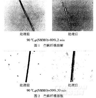 以上3種狀態可用EDA理論進行解釋:NMMO分子中的強極性官能團fN一0)上氧原子的兩對孤對電子可以和纖維素大分子中的羥基形成1~2個氫鍵,生成纖維素一NMMO—H:O絡合物,這種絡合作用先在纖維素的非晶區進行,破壞了纖維素大分子間原有的氫鍵.由于過量的NMMO溶液存在,絡合作用逐漸深人到結晶區內,繼而破壞纖維素的聚集態結構,最終使苧麻纖維溶解.苧麻纖維溶脹91在NMMO溶液中,其中的水分子可以與苧麻纖維的羥基競爭NMMO并與之形成氫鍵,使NMMO對苧麻纖維素的溶解能力減弱,從而達到只溶脹而不溶解.當NMMO溶液中含水率>80%時苧麻纖維不溶脹,原因是大部分NMMO分子與水分子形成氫鍵,影響了NMMO分子與苧麻纖維絡合,使之對纖維的溶脹作用失效.