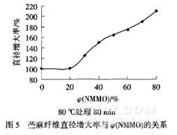 由圖5可知,當φ(NMMO)=30%~80%時,苧麻纖維有溶脹現象;8O%時,溶液對苧麻纖維的溶脹作用最大(90%的水溶液難以配制),達到210%.隨著體積分數的降低,纖維直徑增大率逐漸下降.當q~(NMMO)≤20%時,其溶脹增大率與水溶液基本一致,達到100%.