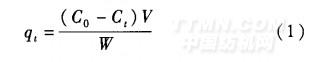 式中:qt是t時的吸附量,mg/g;C。為溶液初始濃度,mg/L;Ct為t時溶液濃度,mg/L;V為溶液體積,L;W為試樣質量,g。