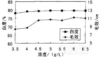 相同條件下,未處理織物的毛效為5﹒2cm,白度值為77.15%。從圖1可知,當TF一109的質量濃度小于4.5g/L時,毛效值隨質量濃度增加而迅速增加,這是由于TF.109質量濃度提高,利于去除氨綸彈力織物上的雜質和油劑。質量濃度大于4.5g/L時,毛效緩慢增加,變化幅度不大。這是因為TF一109質量濃度高于4g/L時,由于織物上的雜質和油劑已基本除凈,所以即使再增加精練劑的濃度,也不會大幅度地提高織物的毛效。分析圖1白度曲線可知,在精練劑的質量濃度低于4g/L時,白度值隨著精練劑質量濃度增加而增加。而當質量濃度高于4L時,織物的白度受濃度變化影響較小。