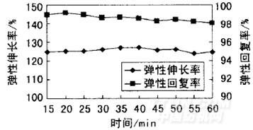 由圖6可知,隨精練時間增加,織物彈性回復率緩慢降低,因此,處理時間不宜過長。精練時間對織物白度和彈性伸長影響較小。處理時間以20~40min為宜。