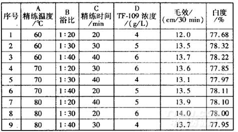 109質量濃度>精練溫度>浴比和精練時間。優選方案為A3B3C2D3,即TF一109質量濃度6g,/L,浴比l:40,精練溫度8O℃,處理時間30min。影響織物白度的主次順序為:TF一109質量濃度>浴比和精練時間>精練
