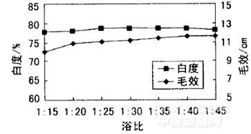 由圖7可知,浴比從1:15提高至1:20,對毛效的提高作用較明顯。此后繼續提高浴比,毛效變化不大。從白度變化曲線看,其受浴比變化的影響很小。