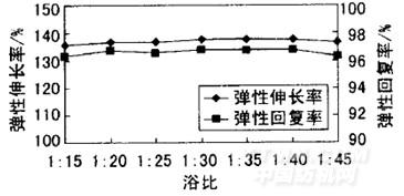 采用精練溫度80℃,處理時間30min,TF一109質量濃度5g/L,碳酸鈉質量濃度2L,測定不同浴比下的精練效果及彈性性能,見圖7和圖8。