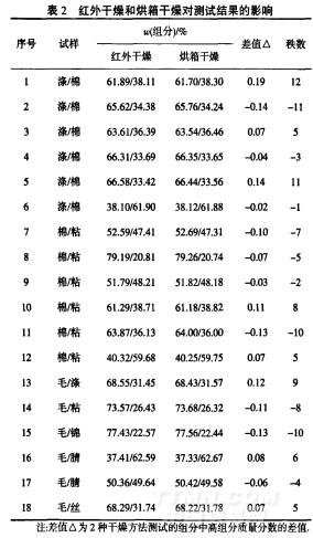 由于紅外干燥是通過熱輻射對(duì)樣品進(jìn)行加熱,樣品內(nèi)部升溫較快,且通風(fēng)散熱性能差,而二組分紡織品在經(jīng)過化學(xué)溶解反應(yīng)后,在玻璃砂芯坩堝中的殘留物為濕態(tài),不適合直接紅外干燥,往往達(dá)不到快速烘干的目的.因此,在反應(yīng)后第二次紅外干燥前采用烘箱預(yù)烘干30min,并對(duì)18組常見組分樣品開展具體的試驗(yàn)比對(duì).由表2可知,對(duì)比2組分纖維含量的試驗(yàn)室數(shù)據(jù),幾種干燥方法對(duì)測(cè)試無顯著性差異,再利用成對(duì)數(shù)據(jù)的秩和檢驗(yàn)法進(jìn)行解析.正秩數(shù)∑T=6l;負(fù)秩數(shù)∑T= -61.確定統(tǒng)計(jì)量丁的值,T=--61.確定臨界值瓦的值,死的值查秩和檢驗(yàn)臨界表,樣本數(shù)N=18,在95%置信區(qū)間中,取a=0.05,則T0.05曬=47.由于T> T0.05,2種方法的測(cè)試結(jié)果差異不大,即用紅外干燥和烘箱干燥所得定量分析結(jié)果無顯著性差異.因此,紅外干燥法符合GB/T2910—2009系列標(biāo)準(zhǔn),紡織品2組分纖維混紡產(chǎn)品定量分析方法測(cè)試要求.