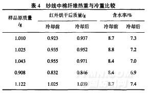 紡織品經(jīng)紅外干燥法烘燥后一般也要在干燥器中冷卻120min,本部分試驗(yàn)是進(jìn)一步探討紅外干燥后能否將干燥器冷卻的120min省掉.以全棉紗線為研究對(duì)象,經(jīng)紅外烘干后冷卻120min前后稱重,結(jié)果見(jiàn)表4.