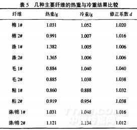 從表5中可以發(fā)現(xiàn),主要纖維成分的熱重與冷重的修正系數(shù)值在1.006~1.040.其中,滌綸為1.006左右,棉為1.018左右,毛為1.039左右,粘膠為1.035左右,滌/棉混紡織物為1.014.
