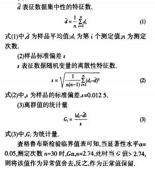 參照GBfr2910—2009中的精密度,對(duì)于混紡均勻的紡織材料,本法采用當(dāng)置信度為95%時(shí),誤差率不超過(guò)±l%.將試驗(yàn)數(shù)據(jù)代人式(1)、(2),求得樣品的平均值、標(biāo)準(zhǔn)偏差,然后將試驗(yàn)數(shù)據(jù)從小到大排序,將數(shù)據(jù)代入式(3),按照格魯布斯檢驗(yàn)法判斷該值是否異常,如為異常值,則應(yīng)舍去,最后將正常值代入式(4)、(5).