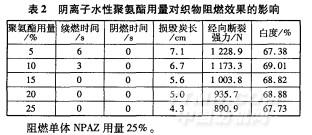 陰離子水性聚氨酯在阻燃過程中的作用比較復雜,其自身并不具備優(yōu)良的熱穩(wěn)定性,但其分子中富含大量的碳元素,可以作為阻燃過程中的炭源。陰離子水性聚氨酯用量對阻燃效果的影響見表2。
