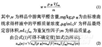 高效液相色譜法測定紡織品游離甲醛含量時(shí),影響不確定度的主要因素有:(1)標(biāo)準(zhǔn)使用液的不確定度;(2)標(biāo)準(zhǔn)曲線的不確定度;(3)樣品處理的不確定度;(4)測試方法重復(fù)性的不確定度.