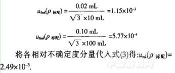 確定度根據(jù)硫酸法標(biāo)定甲醛溶液的要求,硫酸溶液濃度c(1/2 H2S04)約為0.01 mol/L,而已標(biāo)定的溶液濃度為0.1 mol/L,故應(yīng)稀釋;另外,已標(biāo)定的甲醛標(biāo)準(zhǔn)溶液也須稀釋后才能使用.10 mL單標(biāo)移液管和100 mL單標(biāo)容量瓶的允許誤差分別為±0.02 mL和±0.10 mL,則2者的相對(duì)不確定度分別為: