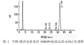 圖1為采用甲醇-緩沖鹽體系流動相時,DBDPO標準品的HPLC色譜圖。