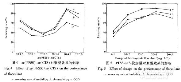 2.3.2投加量對絮凝效果的影響在PFSS與CTS質量比為5:1時,復合絮凝劑的投加量對絮凝效果的影響如圖5所示。PFSS-CTS的用量為(20+4)mg/L時,城市廢水的色度、濁度和COD的去除率達到最高,分別為79.69%、90.97%和83.45%,繼續增加復合絮凝劑的用量,色度、濁度和COD的去除率均呈下降趨勢。因為當投加量不足時,絮凝劑無法完全絮凝水中膠粒,但是當加入絮凝劑的量過多(超過等電點)時,由于靜電排斥作用,絮凝劑膠體懸浮于溶液中,所以濁度、色度和COD的去除率出現下降趨勢。此外過多的絮凝劑,包圍和覆蓋水中的膠體粒子,使懸浮粒子處于穩定狀態,不能聚沉。