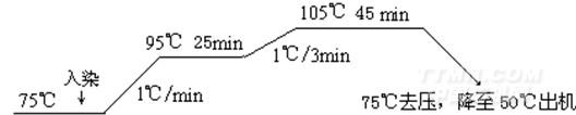 陽(yáng)離子染料用醋酸調(diào)勻,沸水溶解,稀釋后加入染浴,再加入緩染劑1227,控制染浴pH值在4~5,75℃入染10min,按工藝條件逐漸升溫升溫至95℃,25min內(nèi)升溫至105℃保持40~50min)染畢,降至60℃,放水,清洗。