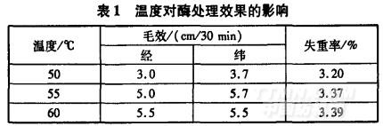 表1中,處理溫度為55℃和60℃時,汗布的失重率和毛效接近,與文獻[1]中酶活最佳溫度范圍相符??紤]到生產(chǎn)中加料溫度一般控制在50-55℃,并且需要蒸汽加熱,為防止局部加熱導(dǎo)致酶失活,酶處理溫度選用55℃。