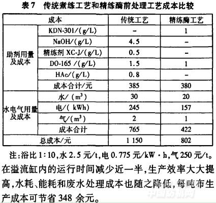 按生產1噸布計算,KDN-301低溫酶精練工藝和傳統(tǒng)煮練工藝的成本比較見表7。