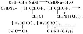 聚環氧氯丙烷胺化物是含有氯甲基的陽離子化合物。在堿性條件下,纖維素纖維形成Cell—O-陰離子,進攻聚環氧氯丙烷胺化物上的碳原子,進行親核取代反應,氯原子離去,形成陽離子化改性棉織物,其反應式如下: