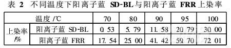 子性,與PARSTER纖維上的陰離子基團反應生成離子鍵,從而完成染色過程。下面以分散型陽離子藍SD-BL與陽離子藍FRR為例,比較它們在染色初期不同溫度下的上染率。