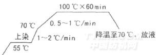 眾所周知,當染色溫度超過了纖維的玻璃化溫度時,纖維的大分子鏈運動增加,纖維結構變得相對疏松,大量染料在較短的時間內迅速上染,從而造成染色不勻。因此,染色過程中必須嚴格控制升溫速率。當溫度在70℃以下時,升溫速率為1. 5~2℃/min;當溫度到達PARSTER纖維的玻璃化溫度后,升溫速率應控制在0. 5~1℃/min,具體升溫曲線如下: