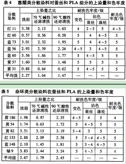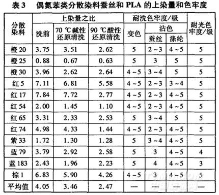 由表3可知,偶氮苯類分散染料對蠶絲的上染量比在PLA纖維的上染量高很多,其在兩種纖維上的上染量之比平均值高達4.05,對蠶絲組分的沾色很嚴重。而蒽醌和雜環結構的分散染料對蠶絲的沾色相對較小,它們對蠶絲和PLA纖維的上染量之比的平均值分別為2.27和2.67,但其在蠶絲上的染色量總體上高于PLA。分散染料對蠶絲組分的沾色嚴重,這與常規分散染料對PLA纖維的染色性普遍不如滌綸[4]有很大的關系。