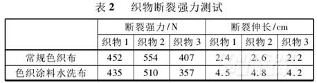 經向4 色,緯向3 色,全棉平紋彩格彩條由表2 可見,成衣水洗后,其面料斷裂強力有所降低,但斷裂伸長有所提高。