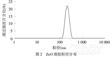 由圖2可見,ZnO粒子平均粒徑在0.25μm左右,粒徑分布相對集中,大致分布在0.13~0.37μm,具有很好的置信度.