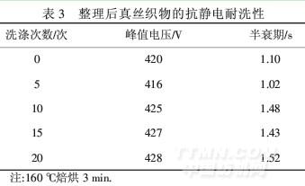 由表3可以看出,隨著洗滌次數的增加,對真絲織物抗靜電性能影響不大.說明整理劑與纖維間結合得很好,ZnO溶膠處理后織物的抗靜電性能具有很好的耐洗性.洗5次時,抗靜電性能變好.原因是整理劑與纖維之間形成了較好的結合,此時織物呈收縮狀態,粒子間空隙較小,導電膜較致密.