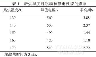 由表2可以看出,隨著焙烘時間的延長,峰值電壓和半衰期不斷降低,抗靜電性能不斷增強;3 min時峰值電壓和半衰期達到最小值;超過3 min后,隨時間的延長,峰值電壓和半衰期不斷增大,抗靜電性能減弱.原因是焙烘時間過短,整理劑在纖維表面未能形成連續導電膜;只有當時間合適,才能產生良好的抗靜電效果;時間過長,導電膜分裂,抗靜電性能下降.因此,較佳焙烘時間為3 min.