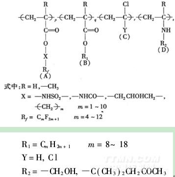 20世紀50年代,美國杜邦公司率先以四氟乙烯乳液作為織物整理劑發表了專利[1]; 1953年,美國3M公司研制成功以全氟羧酸鉻絡合物為主體的拒水拒油織物整理劑[2]。由于以上產品在性能等方面的局限性,很快被含氟丙烯酸酯聚合物取代。1956年, 3M公司成功研制了以Scotchgard FC-208為商品名的織物拒水拒油整理劑[3]。60年代起,日本、西歐等國也相繼研制成功此類產品,產品性能日趨完善。有機氟拒水拒油整理劑一般是氟烷基丙烯酸酯與各種乙烯基系單體的聚合物,其結構如下[4]: