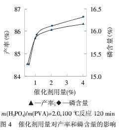 由圖3可知,隨著反應時間的延長,產率和磷含量升高,120 min時產率較高且阻燃劑顏色為白色,超過125 min以后,產率反而有所降低,可能是反應時間過長,導致產物出現脫水炭化,致使產物顏色加深.綜合考慮阻燃劑顏色,選擇120 min.m(H3PO4)/m(PVA)