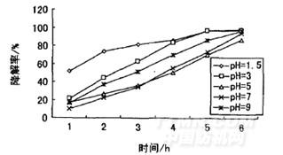 圖5改性納米TiO2在不同初始pH值下的光催化活性表面的吸附以及光生電子和空穴催化劑表面的遷移,進而對光催化反應產生影響[10]。