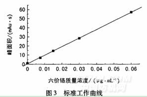 按照2.4節(jié)得到的六價(jià)鉻標(biāo)準(zhǔn)工作曲線見(jiàn)圖3。在0~0.060g/mL六價(jià)鉻質(zhì)量濃度范圍內(nèi)(換算為紡織品中可萃取六價(jià)鉻質(zhì)量分?jǐn)?shù)為0~1.2mg/kg),衍生物峰面積與六價(jià)鉻質(zhì)量濃度呈現(xiàn)良好的線性相關(guān),線性回歸相關(guān)系數(shù)R=O.99982,線性回歸方程為: