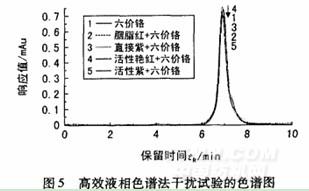 圖5是采用高效液相色譜法得到的色譜圖,利用二極管陣列檢測器掃描色譜峰發現,對應的光譜圖都與圖2相同,且各色譜峰面積基本相同,說明染料的干擾在進入檢測器前已被色譜柱分離消除。