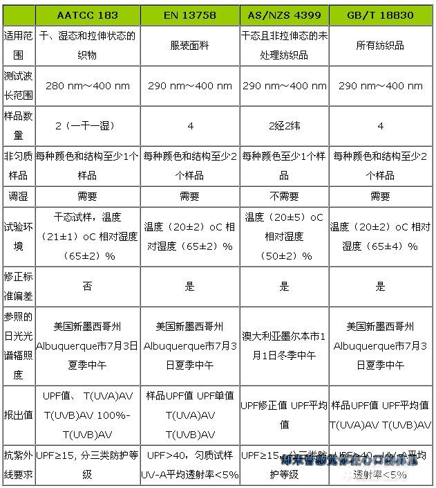 各國(guó)標(biāo)準(zhǔn)對(duì)紡織品防紫外線的測(cè)試要求和判定都不相同,具體見(jiàn)表2。