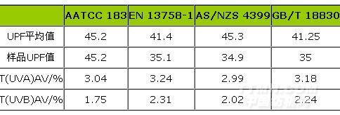 方案:分別采用方法標(biāo)準(zhǔn)EN13758-1:2001、AS/NZS4399:1996、AATCC183-2010和GB/T18830-2009測(cè)試UPF平均值、樣品的UPF值、T(UVA)AV和T(UVB)AV,并對(duì)數(shù)據(jù)進(jìn)行分析。