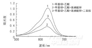 由圖1可知,曲線1為乙酸介質中甲基綠的吸收光譜,最大吸收波長為632nm;曲線2說明高碘酸鉀能氧化甲基綠使之褪色;曲線3說明二苯胺的加入明顯