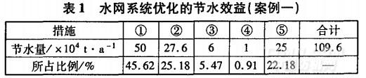 某公司年產3000萬ITI各類織物的印花、染色產品。主要用水設備有皂洗機、氧漂機、絲光機、水洗機、定形機、印花機等。為了減少新鮮水的取水量,減少企業運行成本,從2000年開始,公司就開始對水網系統實行優化,并取得如表1所示節水效益。水網系統優化的總思路和具體措施如下:
