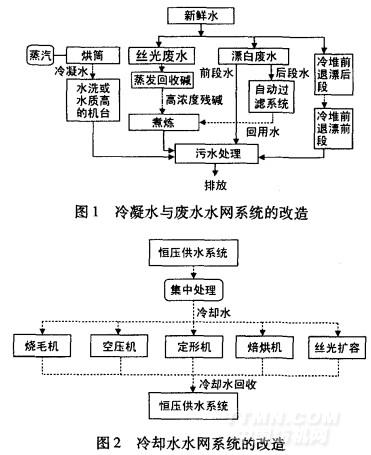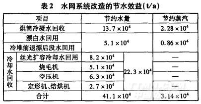 某公司[4]年產15000萬m織物,經圖1和圖2所示水網系統(tǒng)改造后(圖中虛線表示改造的工藝),取得節(jié)水效益見表2。